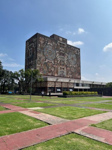 カラフルな石のモザイクで覆われた図書館。先スペイン期から現代までのメキシコの歴史を描いています。